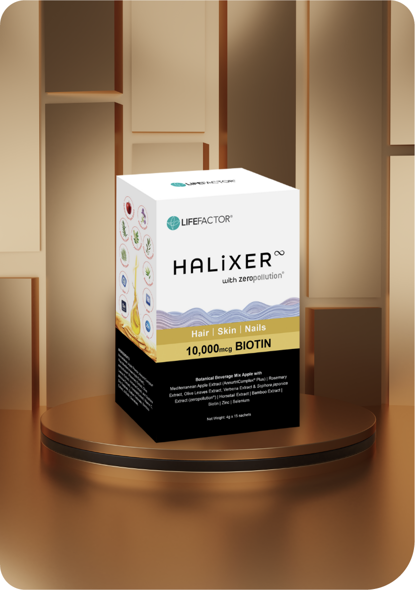 Halixer∞ is an advanced daily supplement formulated with AnnutriComplex®, Zeropollution®, and essential minerals to support hair, skin, nails, immunity, and overall health. It combines beauty and wellness benefits in one capsule.