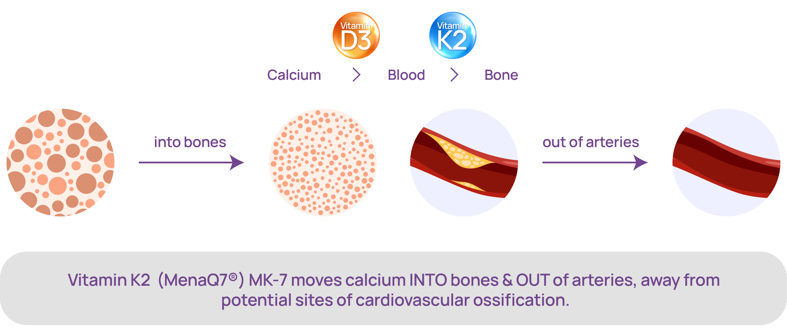 MenaQ7® is essential for calcium absorption activity. It keeps elemental calcium out of the arteries, and it binds it to the bone matrix, hence, ensuring that the calcium reaches the bone. At the same time, the calcium concentration in the blood arteries is minimized preventing calcification in the vessel wall of the arteries, which would lead to cardiovascular incidents if there was no intervention.