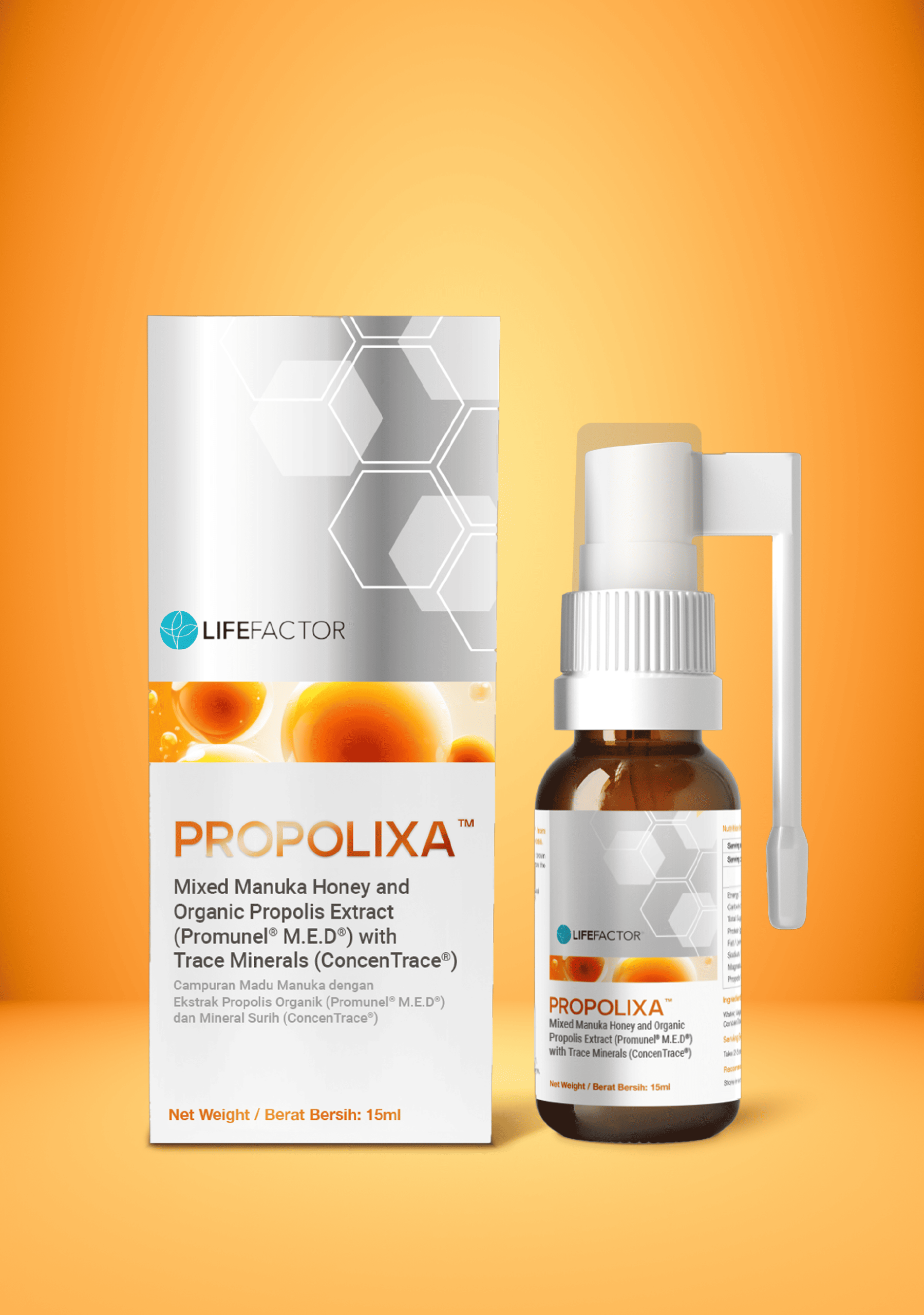 PROPOLIXA™ is a naturally formulated oral and topical spray designed to soothe sore throats, promote wound healing, and strengthen immunity. It combines Italian Promunel® Organic Propolis Extract, New Zealand Manuka Honey, and ConcenTrace® Ionic Trace Minerals to provide fast, effective relief for the entire family.