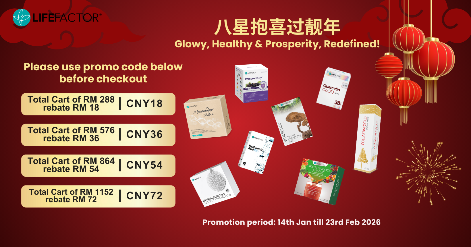 With EVERY purchase of RM 288 and above on Life Factor’s products under single receipt entitled for RM 18 instant rebate.